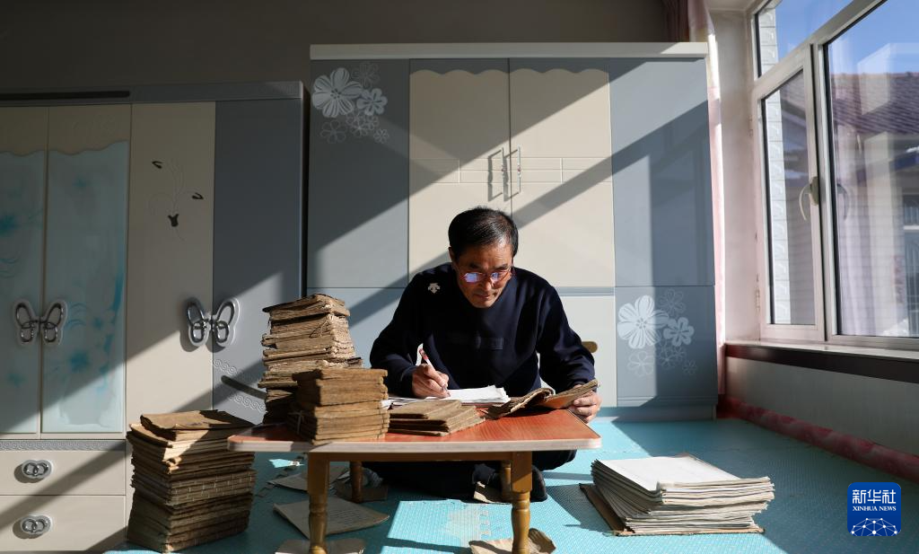 1月24日,吕正业在自己家中为今年将要出版的皮影研究书籍整理收藏多年的戏本,有些戏本已经有百余年历史。