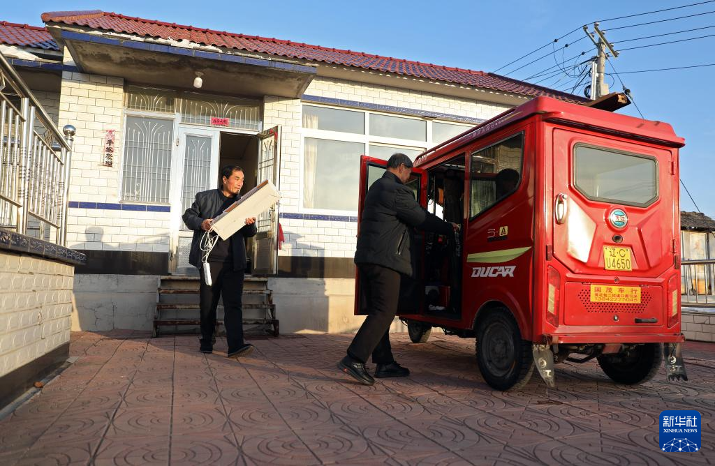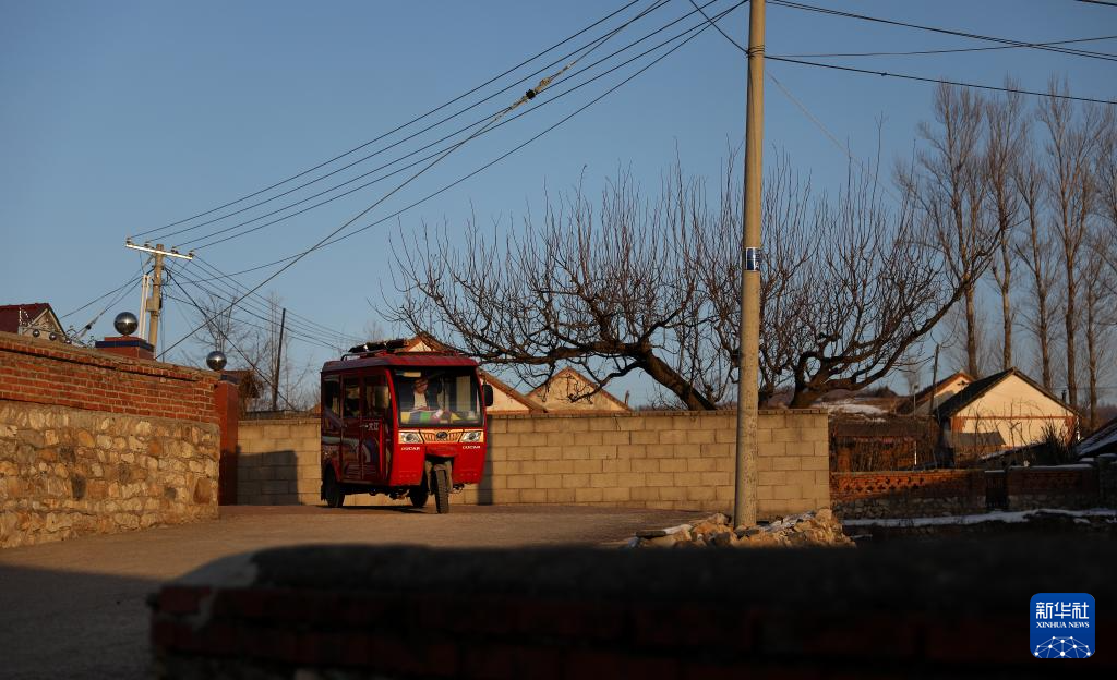 1月25日,吕正业和他的戏班成员一起坐着三轮车,从自家出发赶往乡亲家中表演“愿影”。