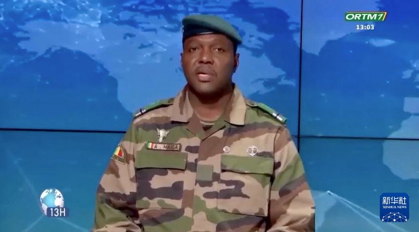 1月28日,马里过渡政府发言人阿卜杜拉耶·马伊加在国家电视台宣读联合公报(视频截图)。