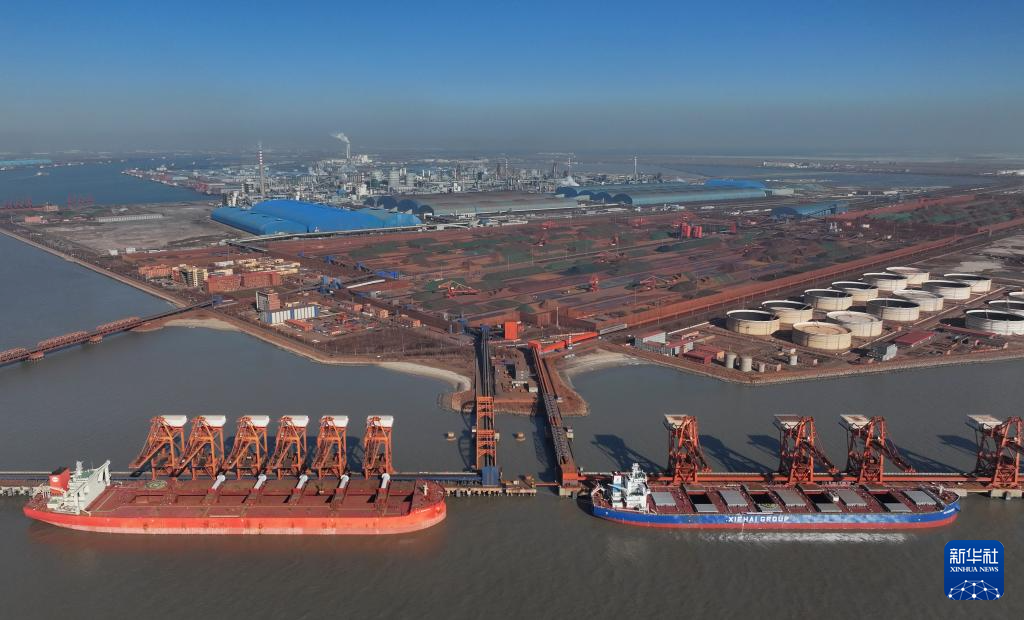 1月28日,两艘轮船靠泊在唐山港京唐港区矿石码头卸载(无人机照片)。