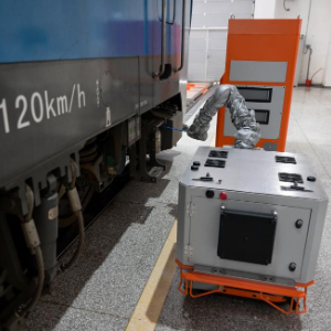 1月29日,在呼和浩特机务段呼和南检修车间,智能吹扫及除尘机器人吹扫万吨重载机车部件。