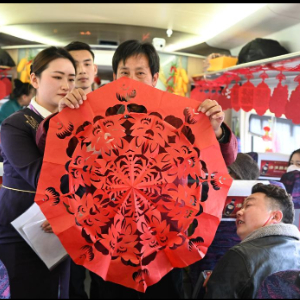 当日,南京客运段在G7575次列车上举办长三角地区特色“年货大集”以及黄梅戏、淮剧、剪纸等非遗文化表演,让旅客春运旅途充满欢声笑语。