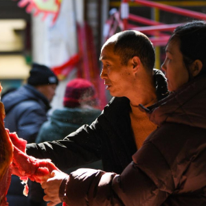1月28日,游客在四川阿坝藏族羌族自治州茂县农贸市场选购牦牛肉。