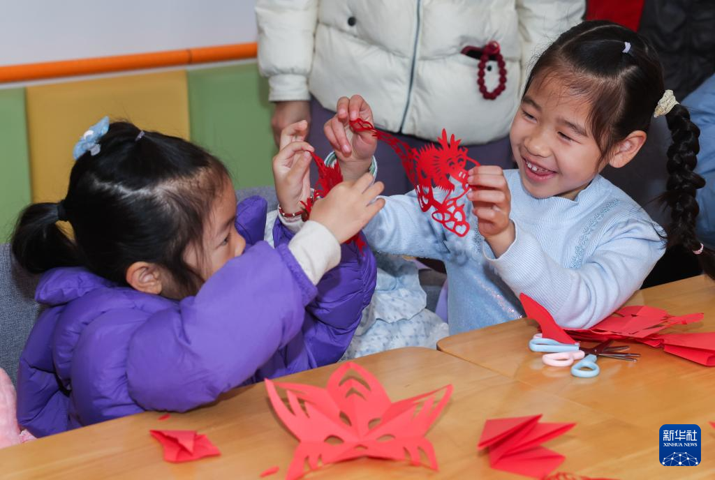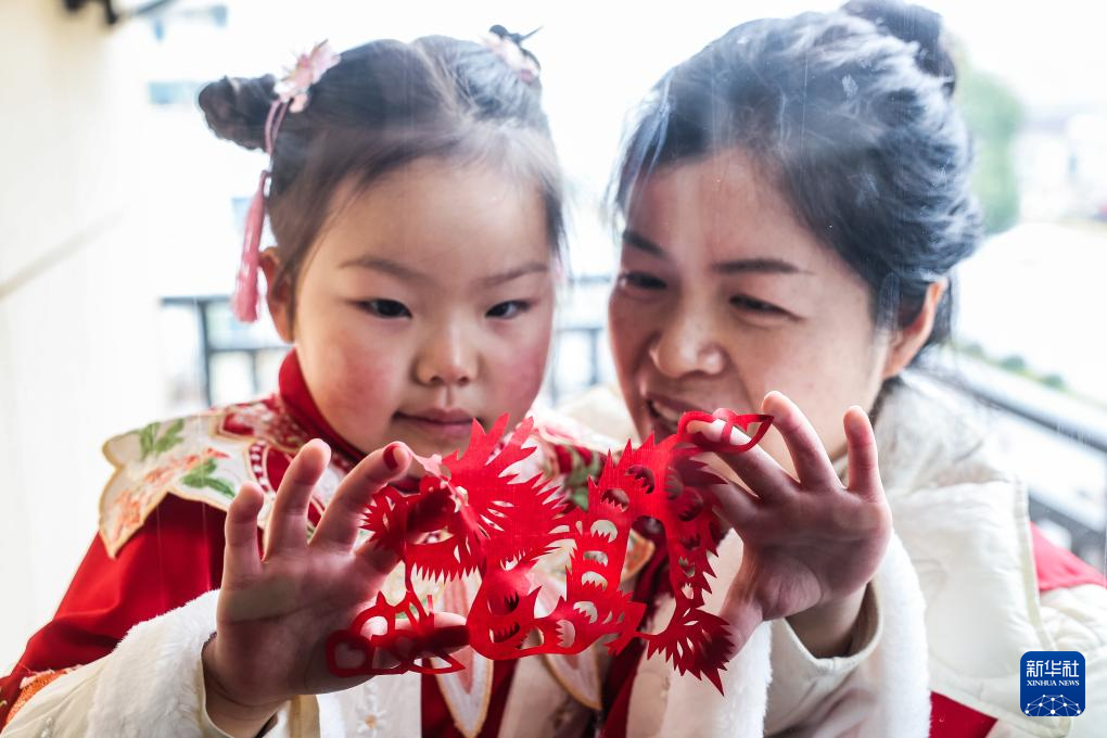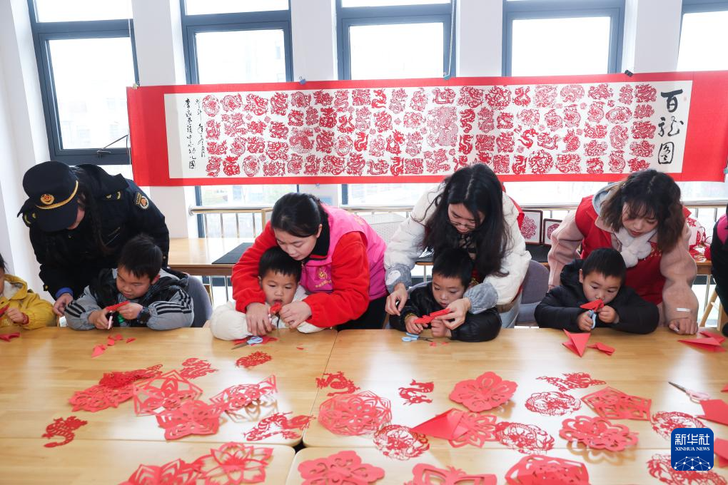 1月30日,浙江省湖州市长兴县李家巷镇中心幼儿园的老师和志愿者带着孩子们剪龙年新春窗花。
