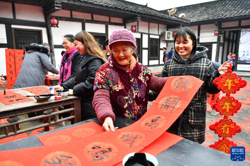 1月29日,四川省广安市邻水县袁市镇大光明社区的群众在“翰墨迎春”文化下乡活动现场领取春联。