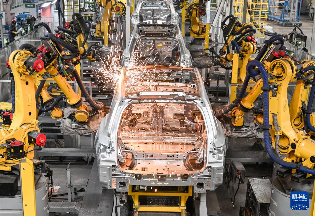 在理想汽车常州基地车间,机械手臂进行焊接作业(1月10日摄)。