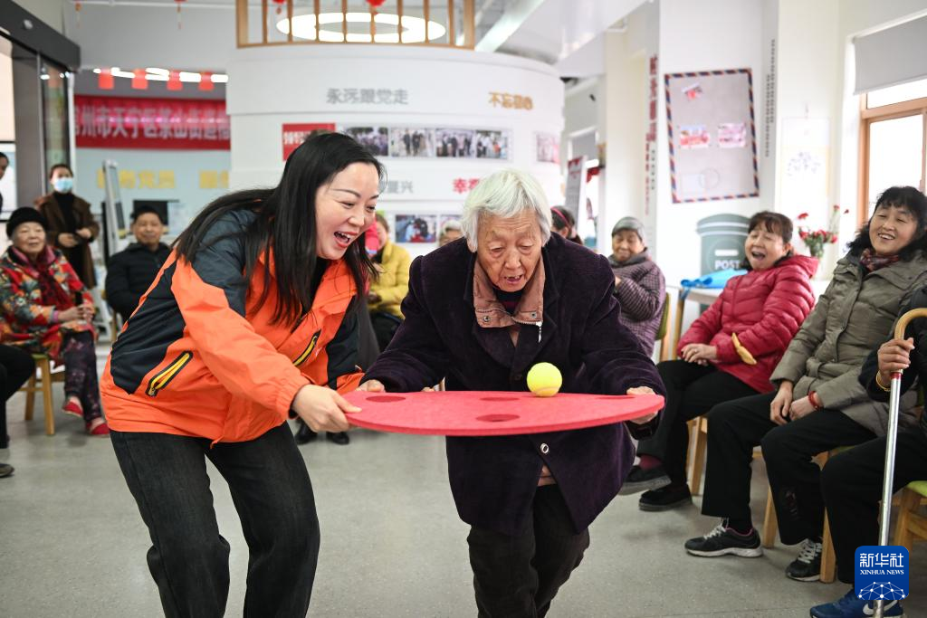 在常州市天宁区茶山街道富强新村社区党群服务中心,工作人员协助老人进行游戏比赛(1月9日摄)。