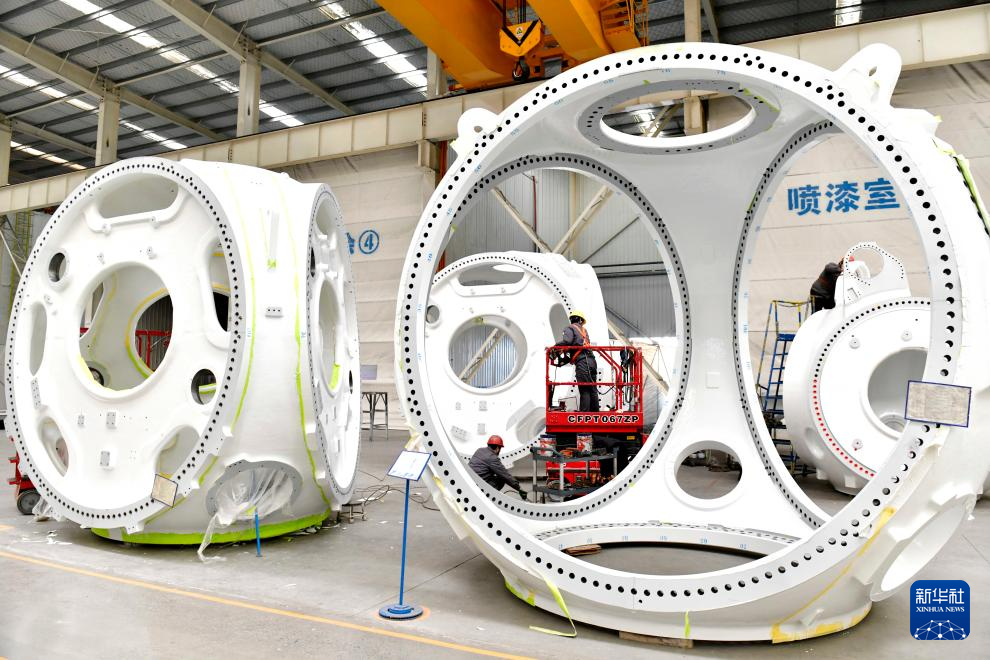 在位于山东滨州市惠民县的山东国创精密机械有限公司,工作人员在对风电轮毂进行喷涂作业(1月26日摄)。