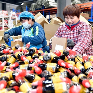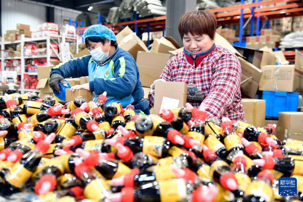 在山东省乐陵市杨安镇调味品产业园,工作人员将调味品打包发货(1月22日摄)。