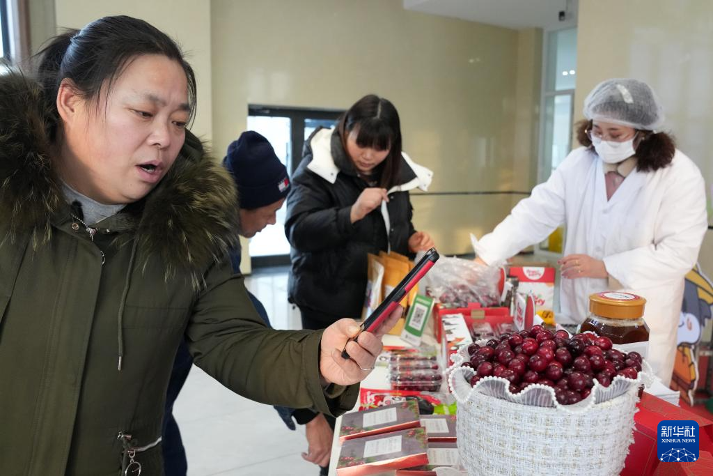 1月29日,在抚远市蔓越莓种植基地,工作人员销售蔓越莓鲜果。