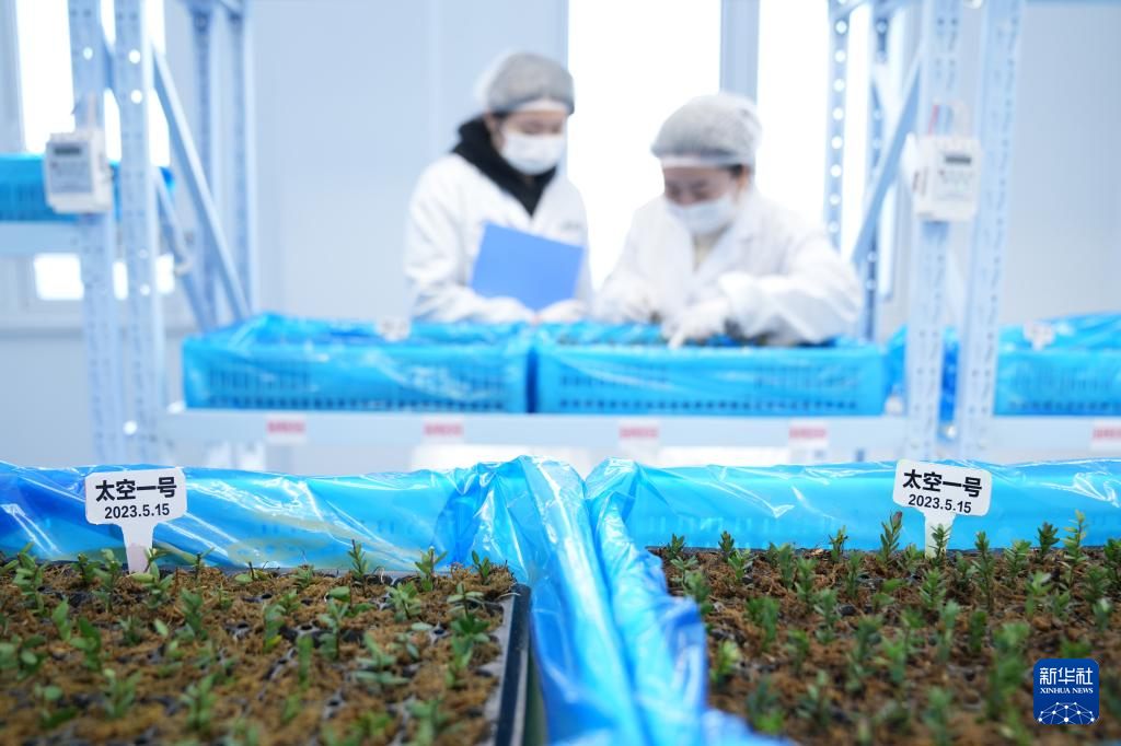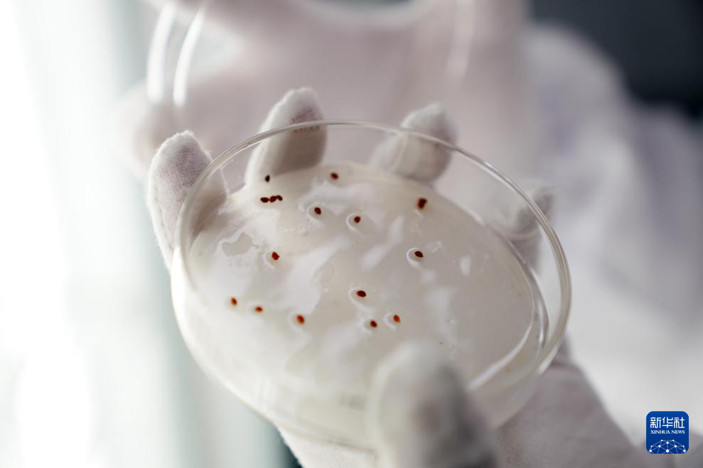 1月30日,在抚远市蔓越莓种植基地研发中心,技术人员查看蔓越莓种子的育种情况。