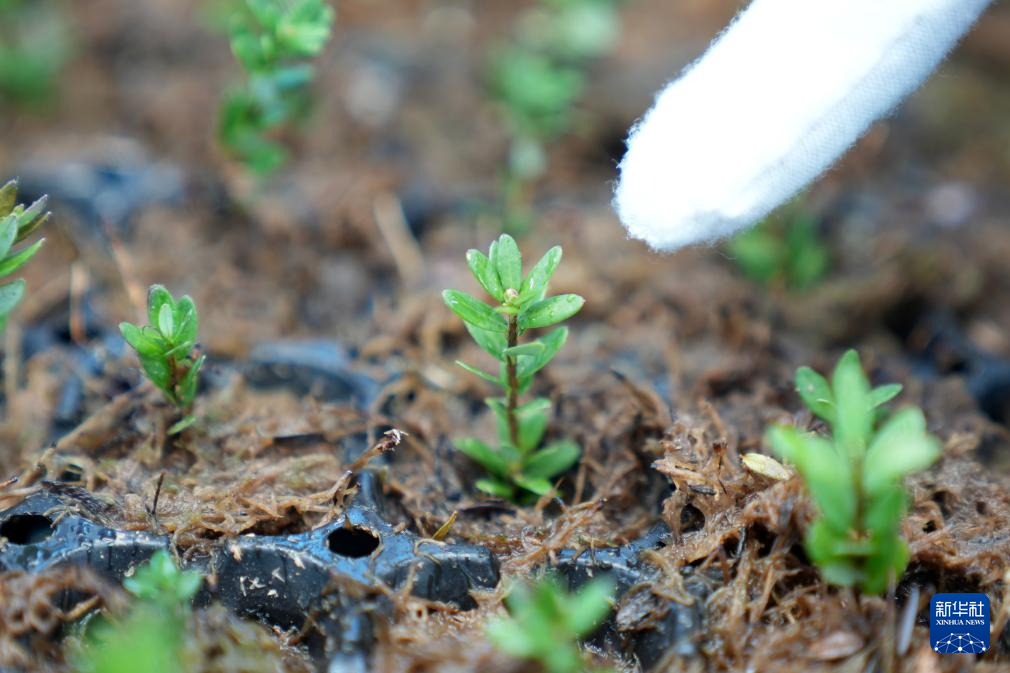 1月30日,在抚远市蔓越莓种植基地研发中心,技术人员在查看蔓越莓秧苗生长情况。
