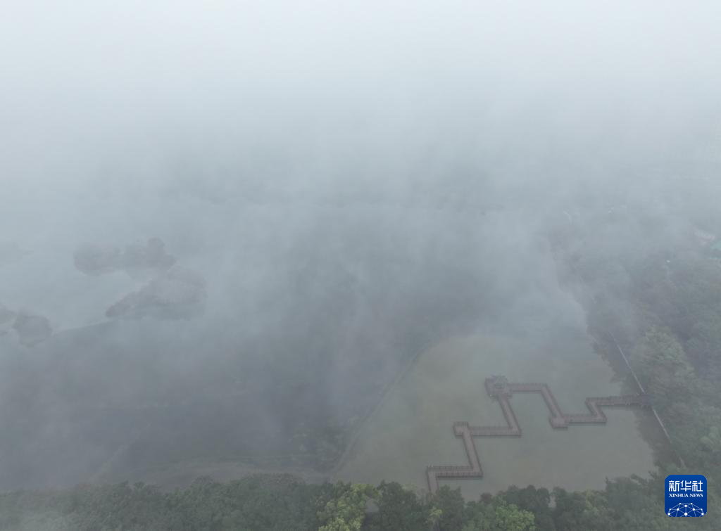 这是1月31日拍摄的被浓雾笼罩的南宁市南湖(无人机照片)。