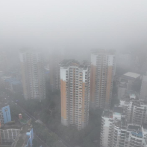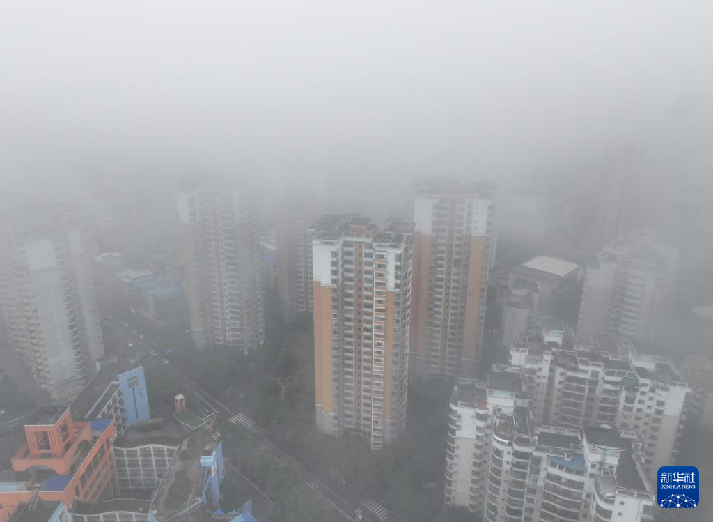 这是1月31日拍摄的被浓雾笼罩的南宁市城区(无人机照片)。