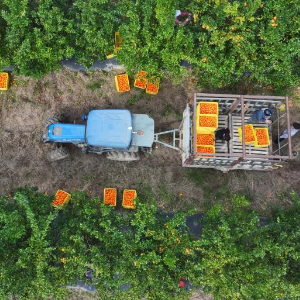 1月31日,村民在贵州省罗甸县木引镇水果基地把刚采摘的红橘装车(无人机照片)。