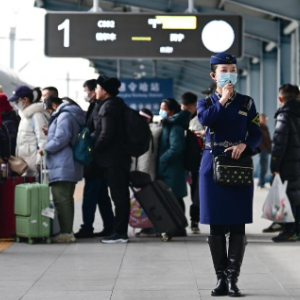 1月30日,中国铁路青藏集团有限公司西宁客运段动车队乘务员王璐在站台提示旅客登车。