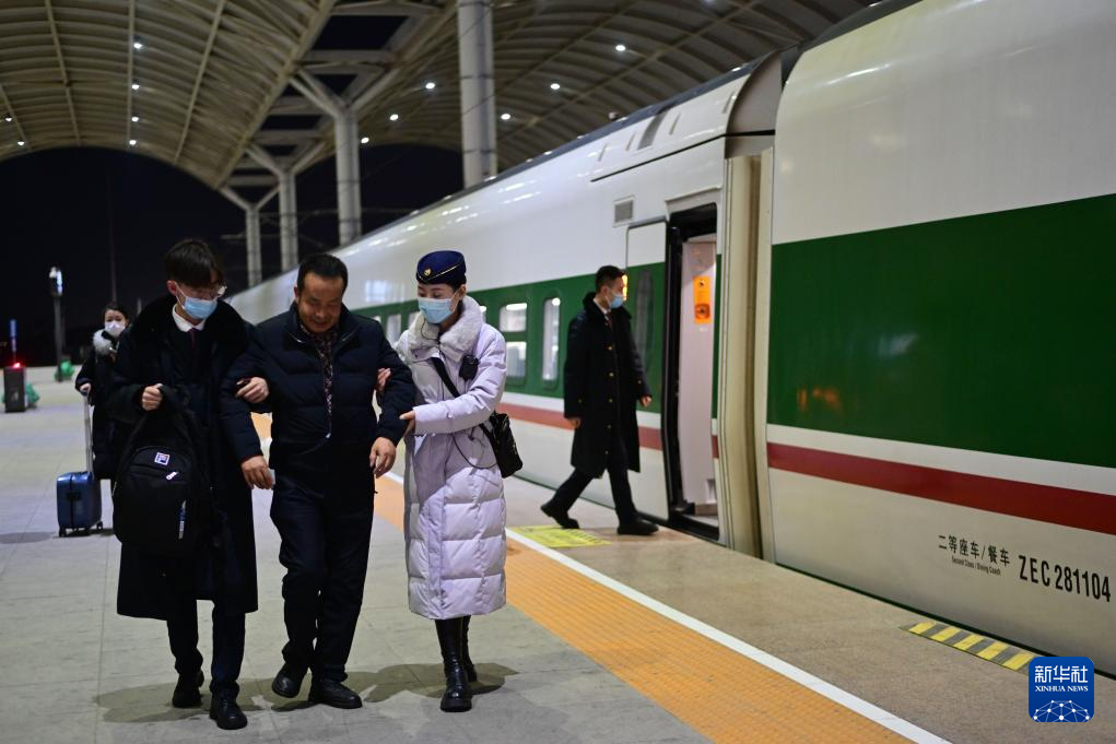 1月30日,中国铁路青藏集团有限公司西宁客运段动车队西格八组乘务员陈丽琴在协助重点旅客下车。