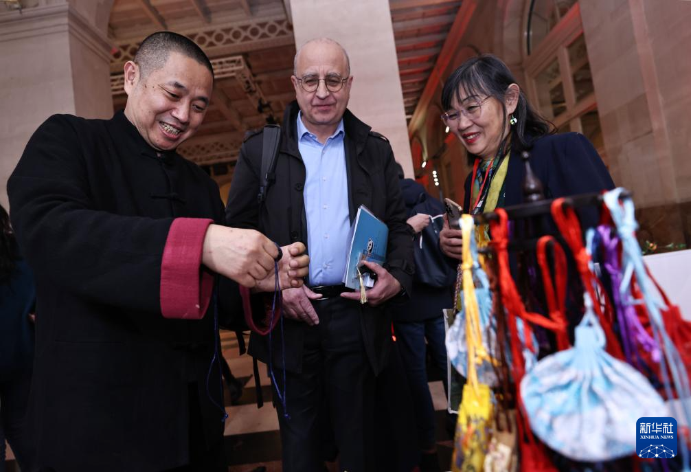 1月30日,在法国巴黎布龙尼亚宫举行的“你好!中国”旅游推介会上,嘉宾体验和香制作。
