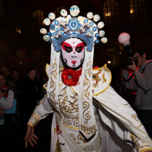 1月30日,在法国巴黎布龙尼亚宫举行的“你好!中国”旅游推介会上,演员表演变脸。