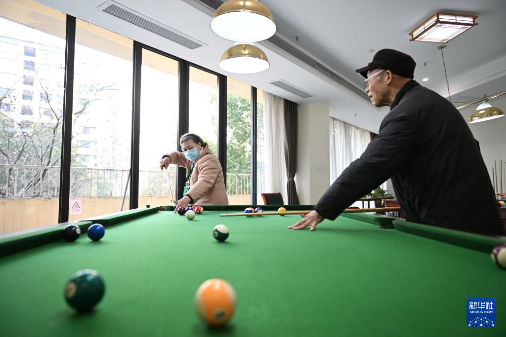 在常州安信颐和颐养公寓,老人在打台球(1月9日摄)。