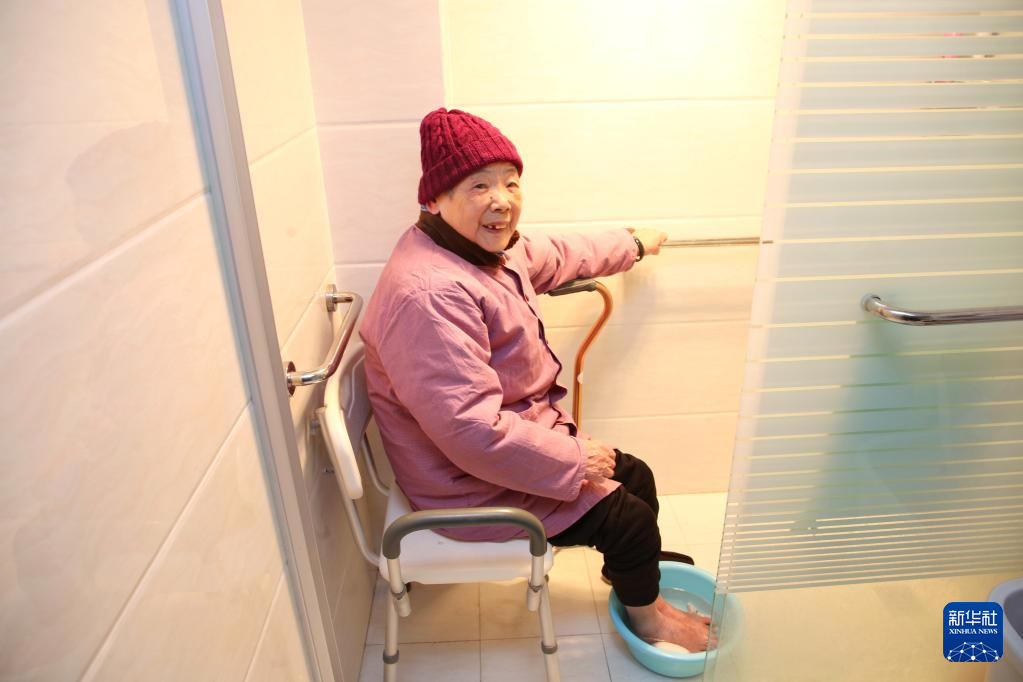 2月1日,在常州市钟楼区荷花池街道,钱金秀老人在家中洗脚。卫生间的适老化改造方便了老人的居家生活。