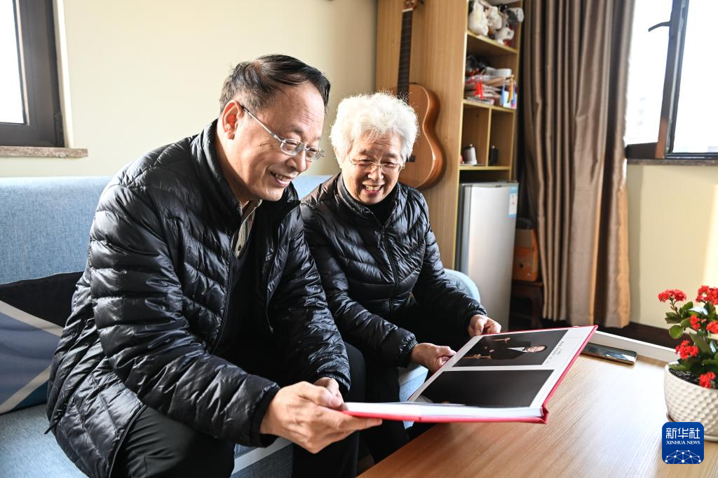 在常州安信颐和颐养公寓,78岁的王希志(左)和77岁的老伴王洁芳翻看养老机构给他们拍摄的婚纱照(1月9日摄)。