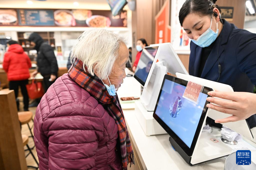 在常州市天宁区茶山街道“茶饭小馆”社区食堂,老人在刷脸支付(1月9日摄)。