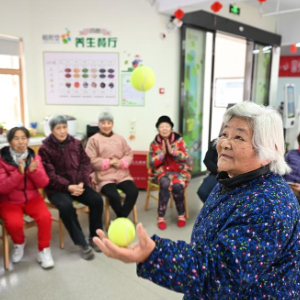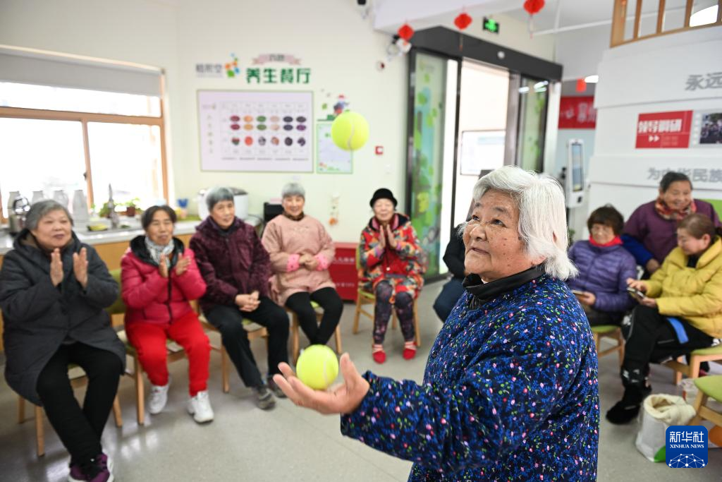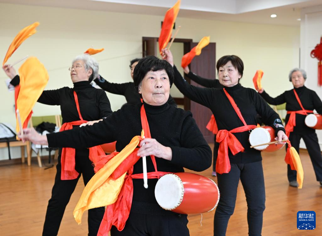 在常州安信颐和颐养公寓,老人在打腰鼓(1月9日摄)。