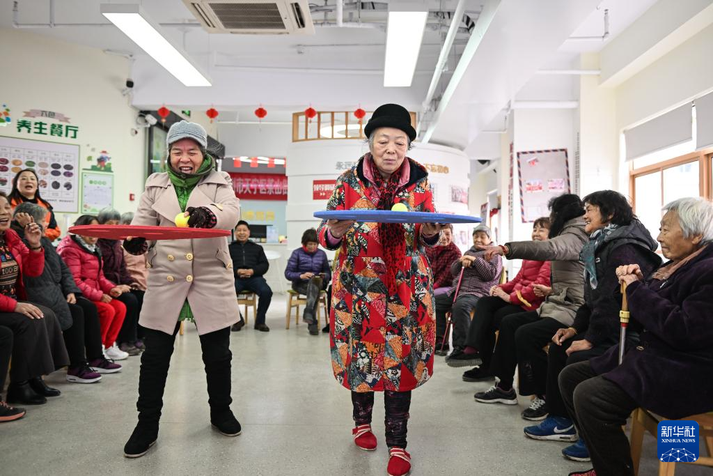 在常州市天宁区茶山街道富强新村社区党群服务中心,老人在进行趣味游戏比赛(1月9日摄)。