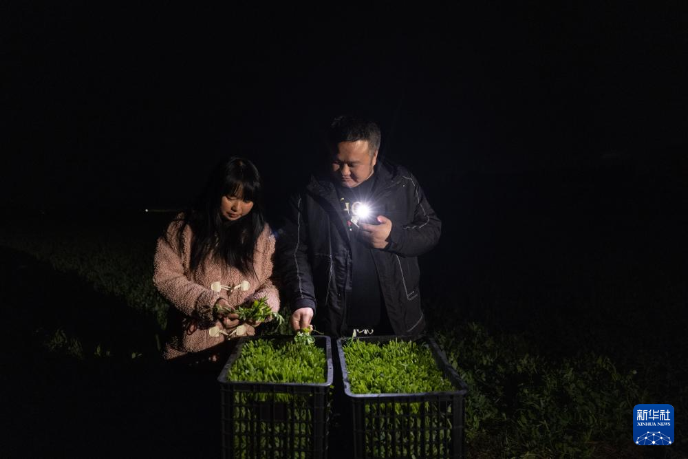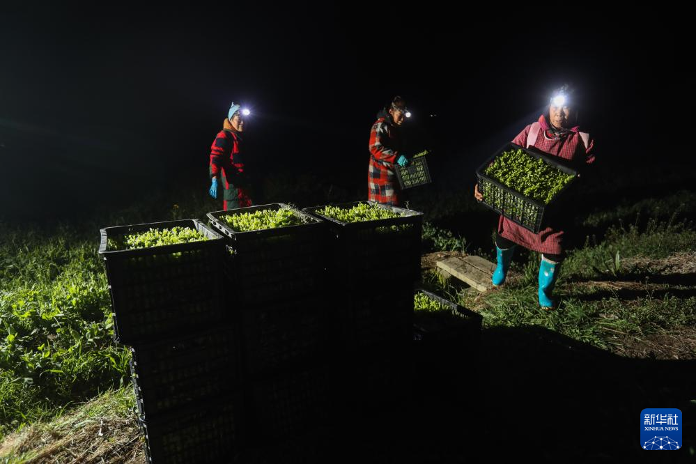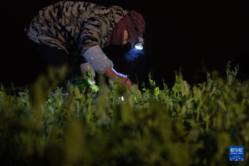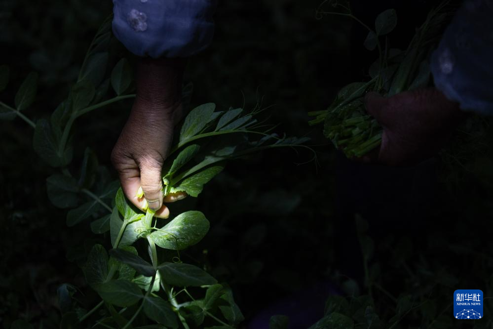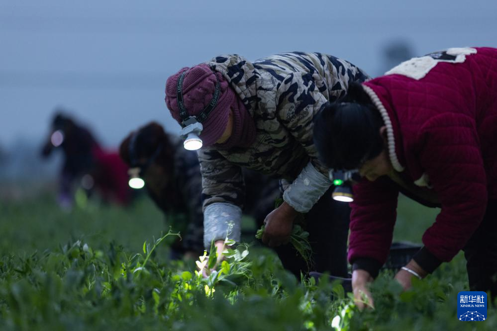 2月1日清晨,在广汉市金轮镇樊池村,村民戴着头灯搬运新鲜的豌豆尖。