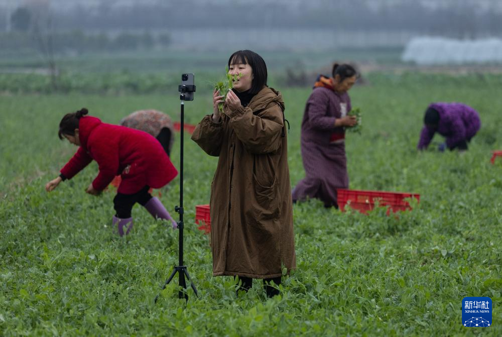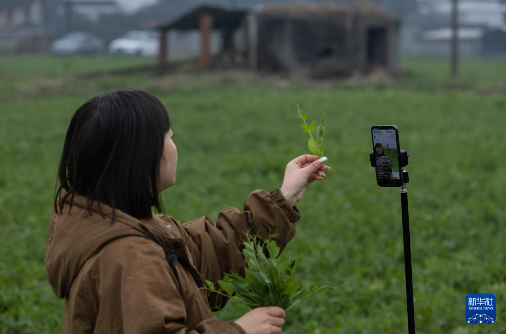 2月1日,在广汉市金轮镇樊池村,当地网络主播钟敏在豌豆尖地里直播带货。