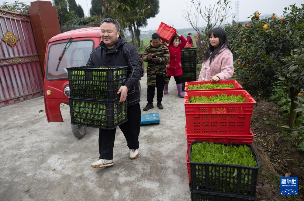2月1日,在广汉市金轮镇樊池村,蔬菜种植大户罗世伟(左一)在搬运刚采摘的豌豆尖。