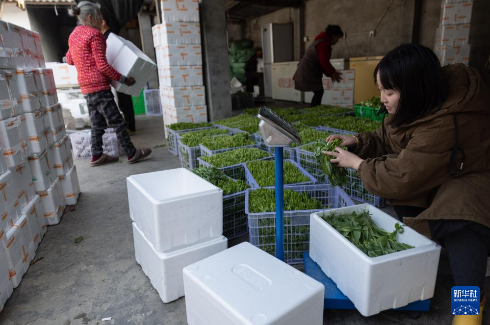 2月1日,在广汉市金轮镇樊池村,当地网络主播钟敏(右)和家人将新鲜的豌豆尖打包发货。这几年她将这里的豌豆尖通过直播卖到北方很多地区。