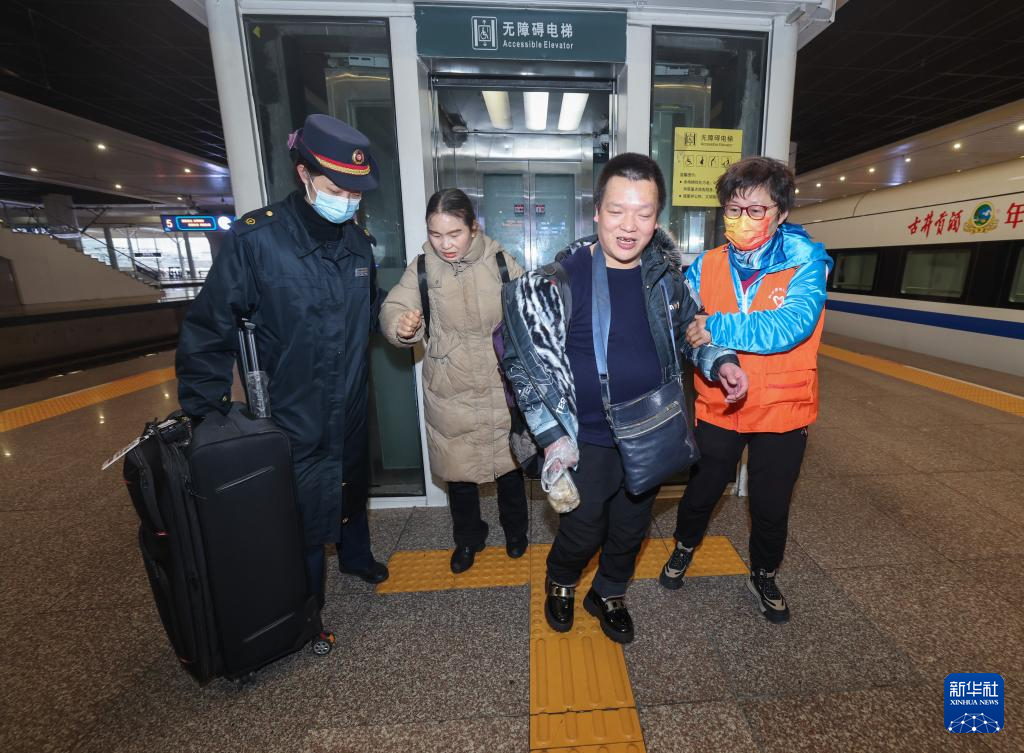 2月1日,杭州东站值班工作人员及志愿者护送盲人旅客走专用通道上车。