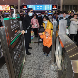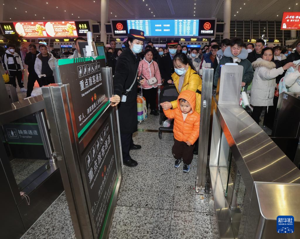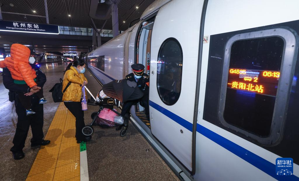2月1日,杭州东站的工作人员在为带孩子的旅客开通提前上车的专用通道。