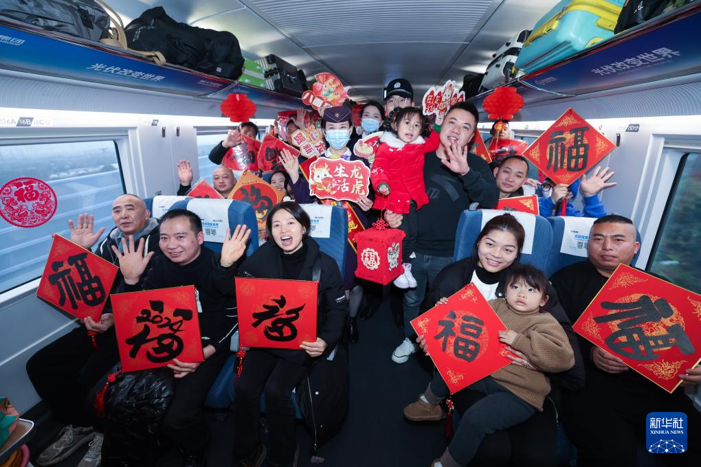 2月1日,在杭州东开往贵阳的G4835列车上,中国铁路上海局集团公司杭州客运段乘务员和旅客们拿着新春“福”字合影。
