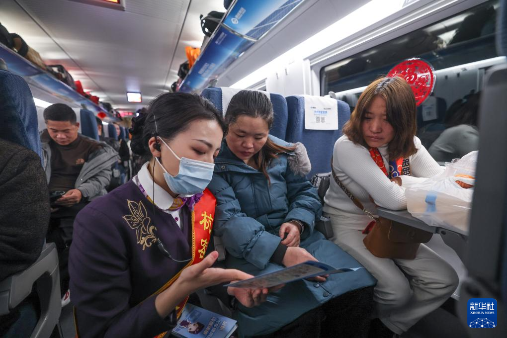2月1日,在杭州东开往贵阳的G4835列车上,中国铁路上海局集团公司杭州客运段乘务员在给旅客进行安全知识普及。