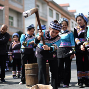 2月1日,搬迁群众在贵州省黔南布依族苗族自治州罗甸县红水河镇红河村打糍粑。