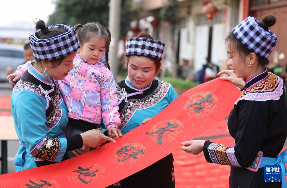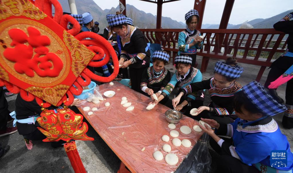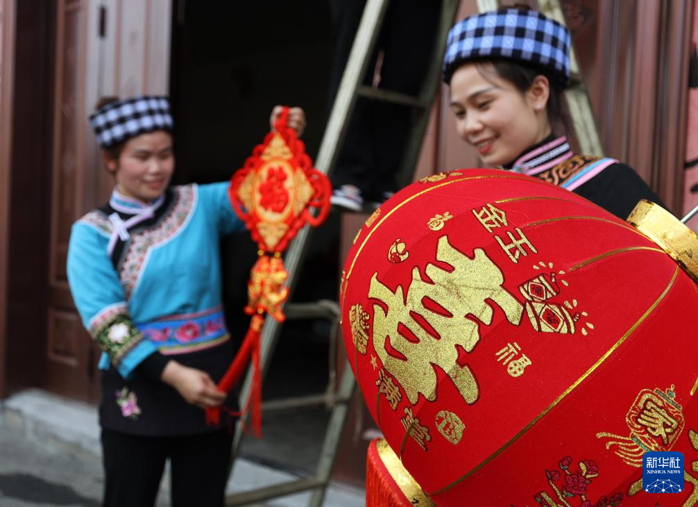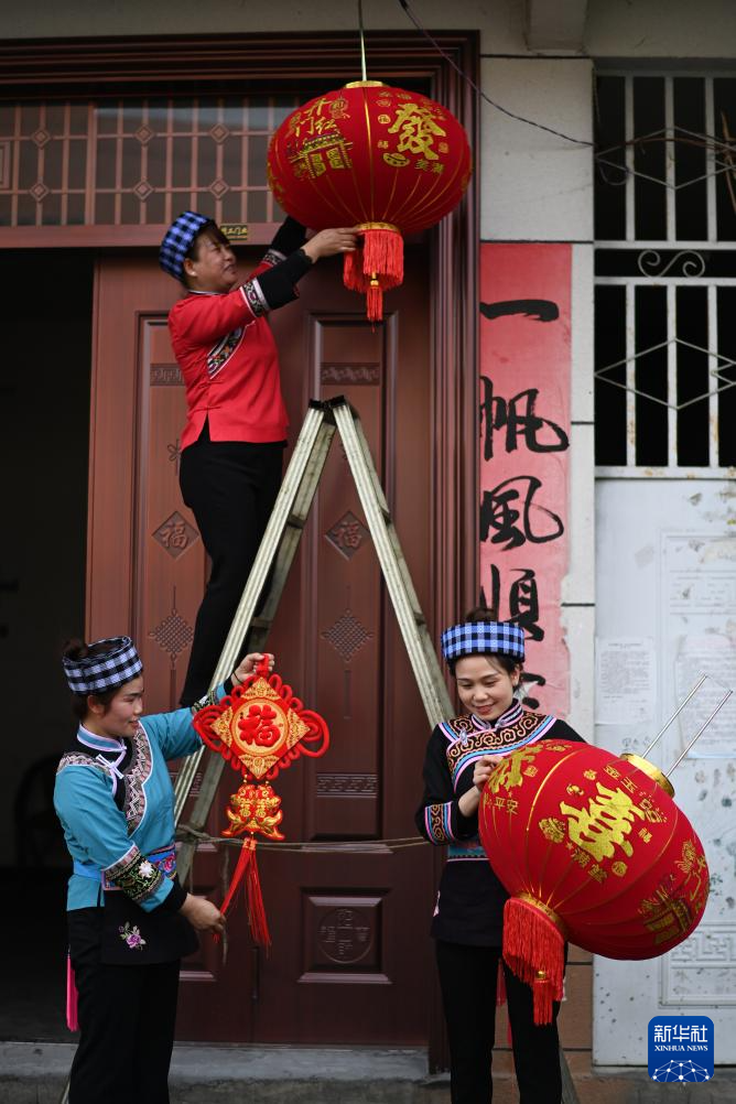 春节临近,贵州省黔南布依族苗族自治州罗甸县红水河镇红河村群众打糍粑、贴春联、挂红灯笼,喜迎农历新年。