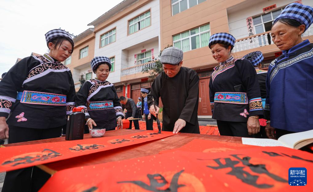 2月1日,书法爱好者在贵州省黔南布依族苗族自治州罗甸县红水河镇红河村为搬迁群众义务写春联。