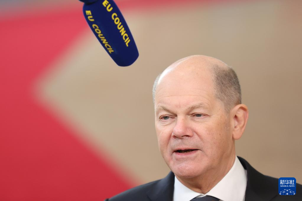 2月1日,德国总理朔尔茨在比利时布鲁塞尔出席欧盟特别峰会时接受媒体记者采访。