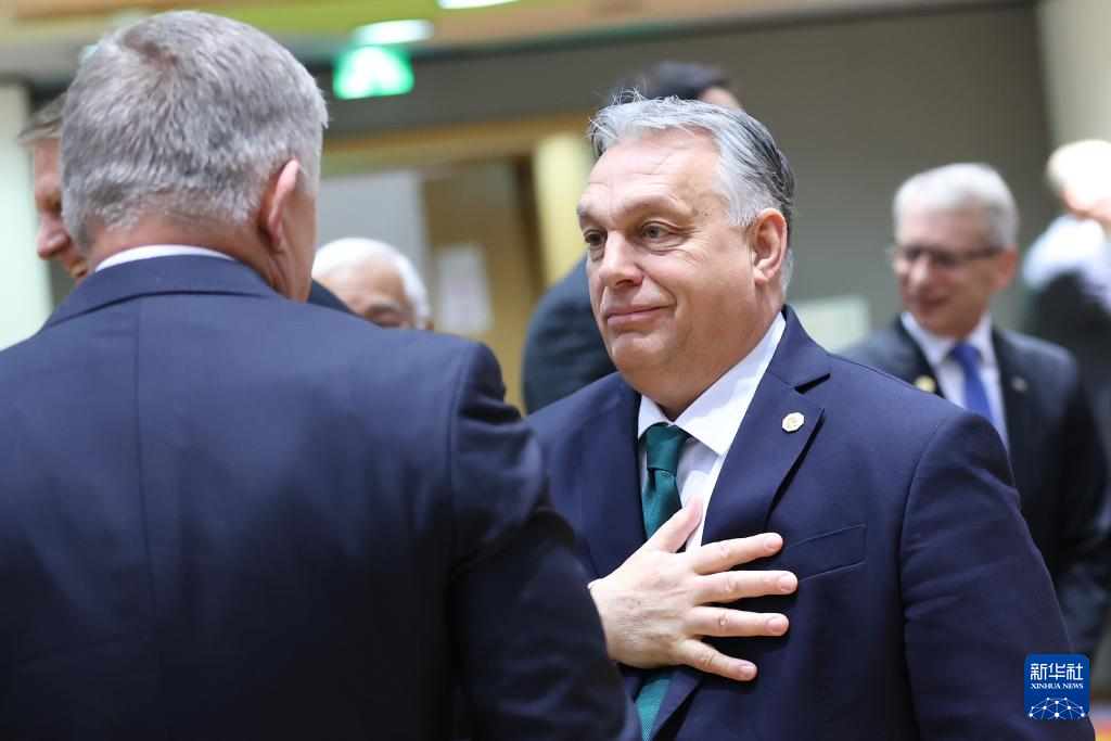 2月1日,匈牙利总理欧尔班(左)在比利时布鲁塞尔出席欧盟特别峰会期间同斯洛伐克总理菲佐交流。