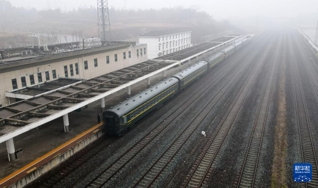 1月31日,K8526次列车从龙桥站发车(无人机照片)。