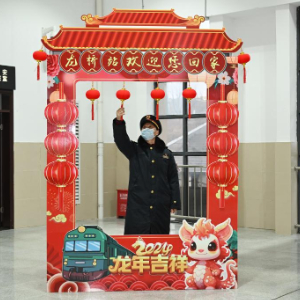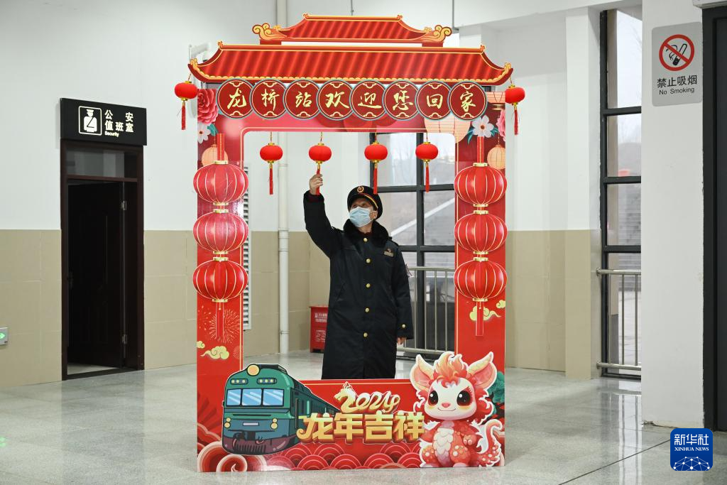 1月31日,在龙桥站候车厅,站长李洪涛在布置新年装饰。