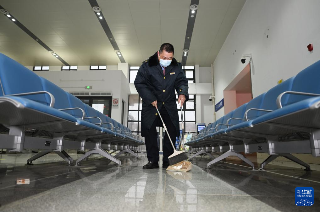 1月31日,售票员张跃在龙桥站候车厅打扫卫生。