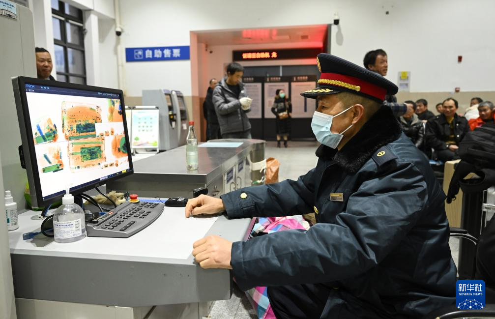 1月31日,在龙桥站候车厅,客运员刘业富对旅客行李进行安检。