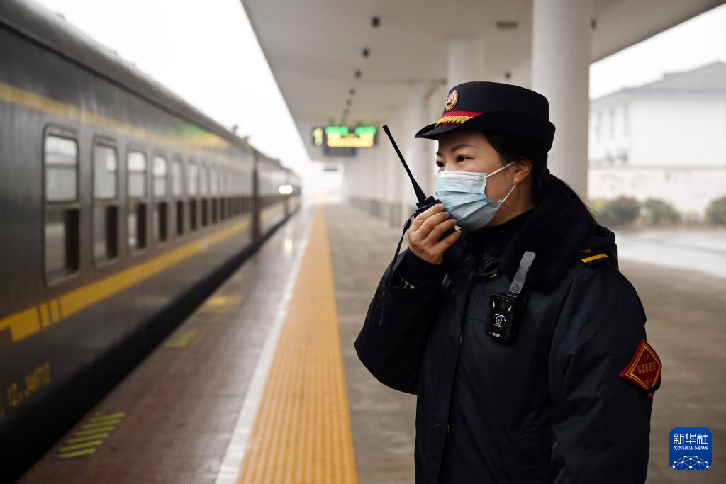 1月31日,在龙桥站站台,客运值班员张静在进行接发列车作业。