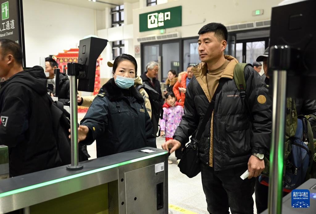 1月31日,在龙桥站候车厅,客运值班员张静(中)组织旅客检票进站。