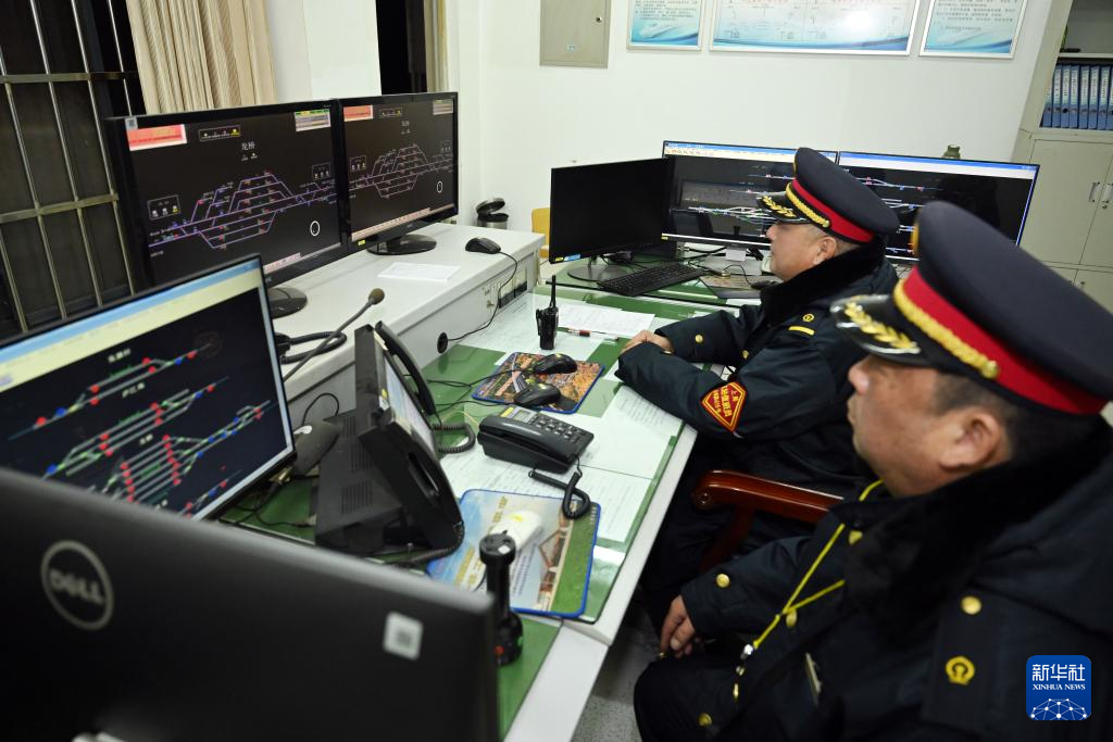 1月30日,在龙桥站行车室,助理值班员蔡其通(前)和车站值班员周恩龙在盯控列车进路。