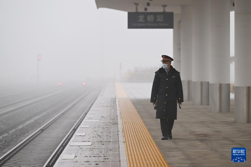 1月31日,在龙桥站站台,站长李洪涛在进行接发列车作业。